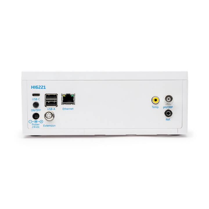 El HI6221 es un medidor de mesa con forma estilizada y pantalla táctil grande, que incluye un módulo de medición de pH/ORP.